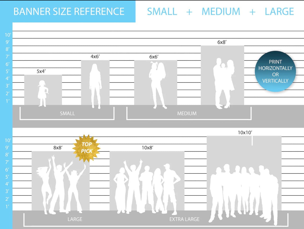 - Extra Large banners: 10ftx8ft and 10ftx10ft. With this option you can fit at least 7-8 people across the banner